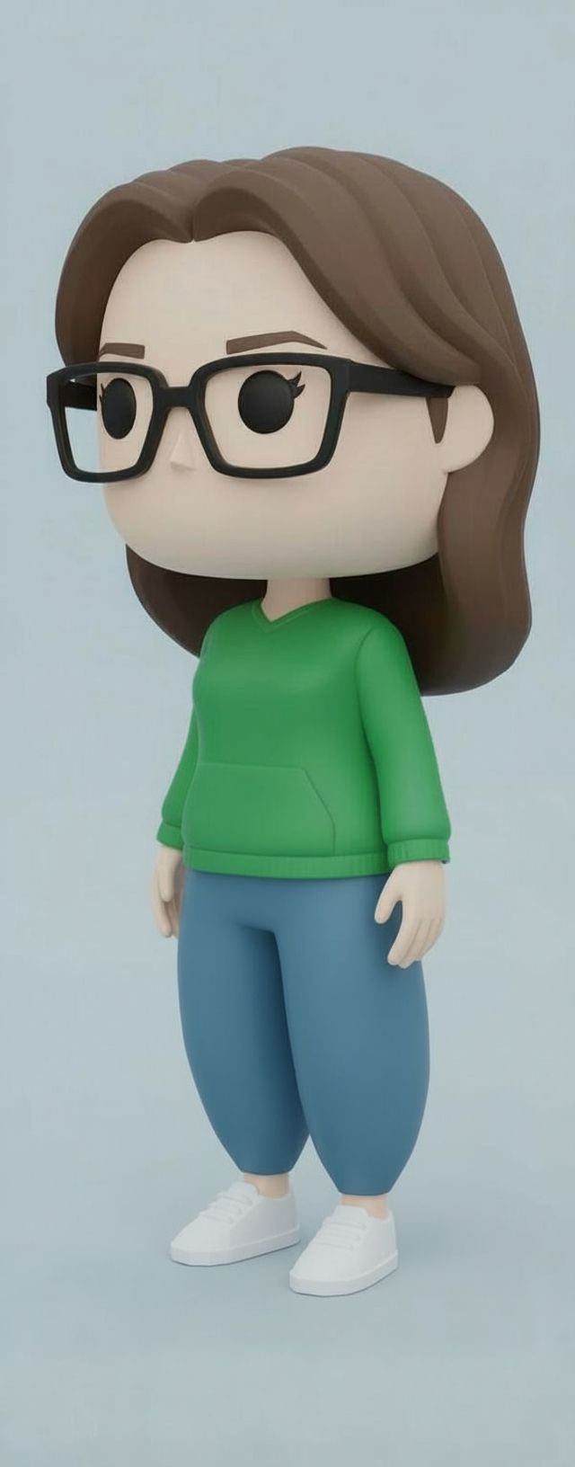 neck short hair, black glasses, female, white skin, green pullover, blue pants - without ice skater