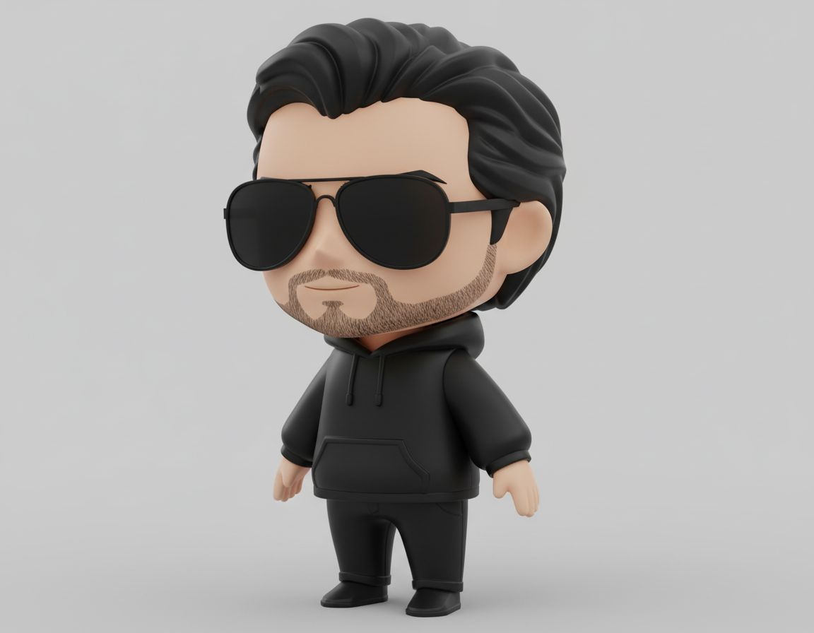 wearing black aviator sun glasses, black hoodie, black jeans, has black hair and a stubble