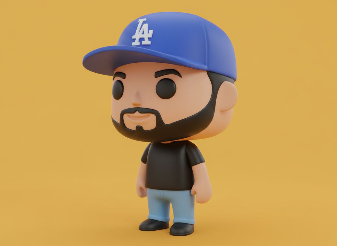 Create a pop figure with blue LA hat. Full body no background. Use the face as a reference