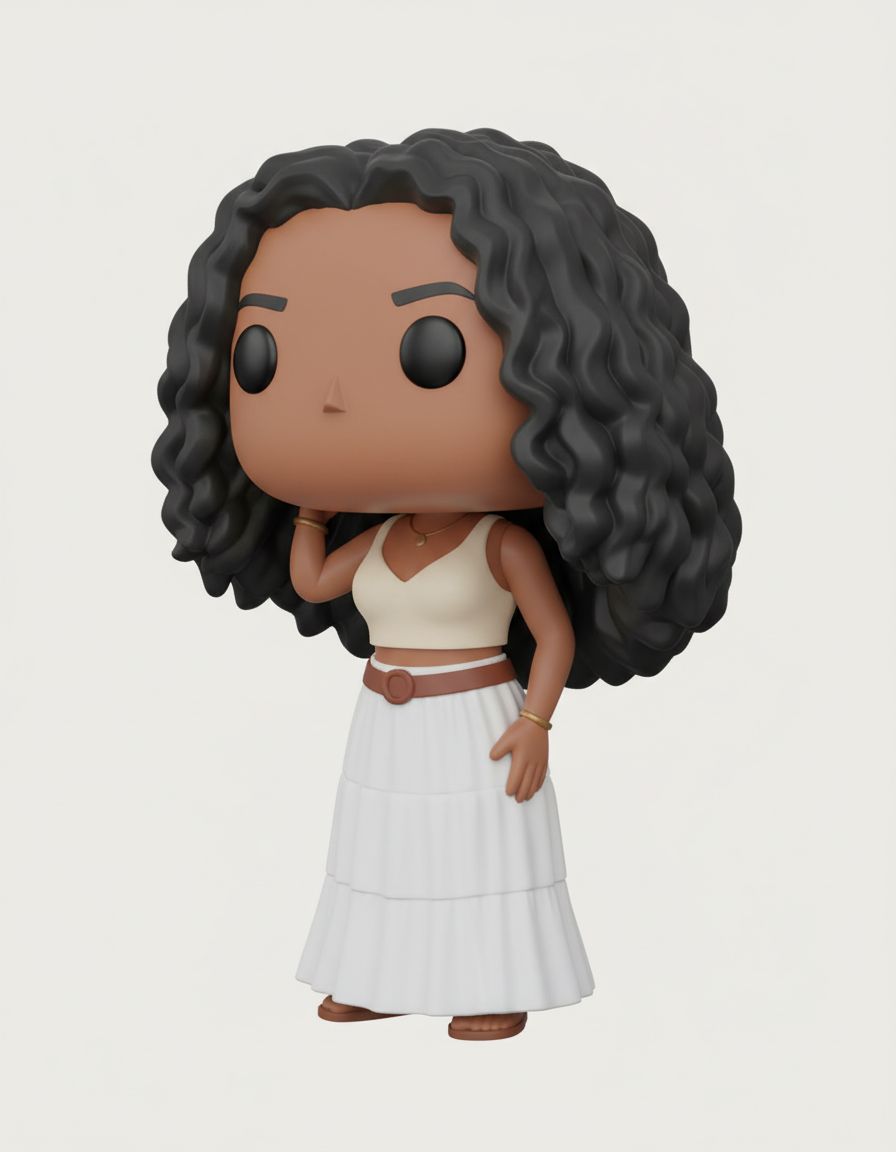 Create a funko pop toy of the person in the picture. Pay close attention to detail of key features i
