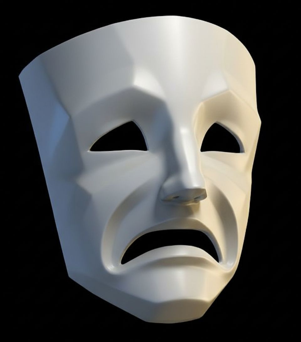 Create a 3D-printable wearable mask model (STL). The mask is white and emotionally split into two ha