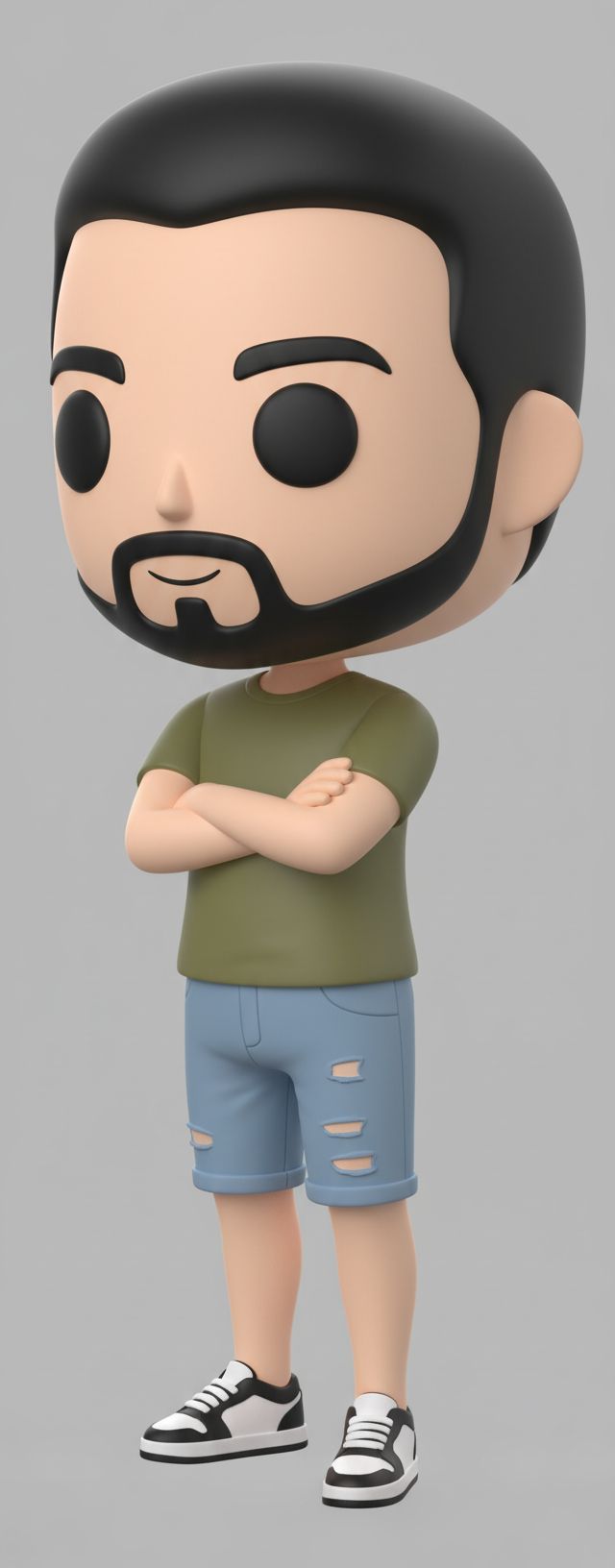 Standing full‑body portrait of a young man with short dark hair and a trimmed beard, wearing an oliv