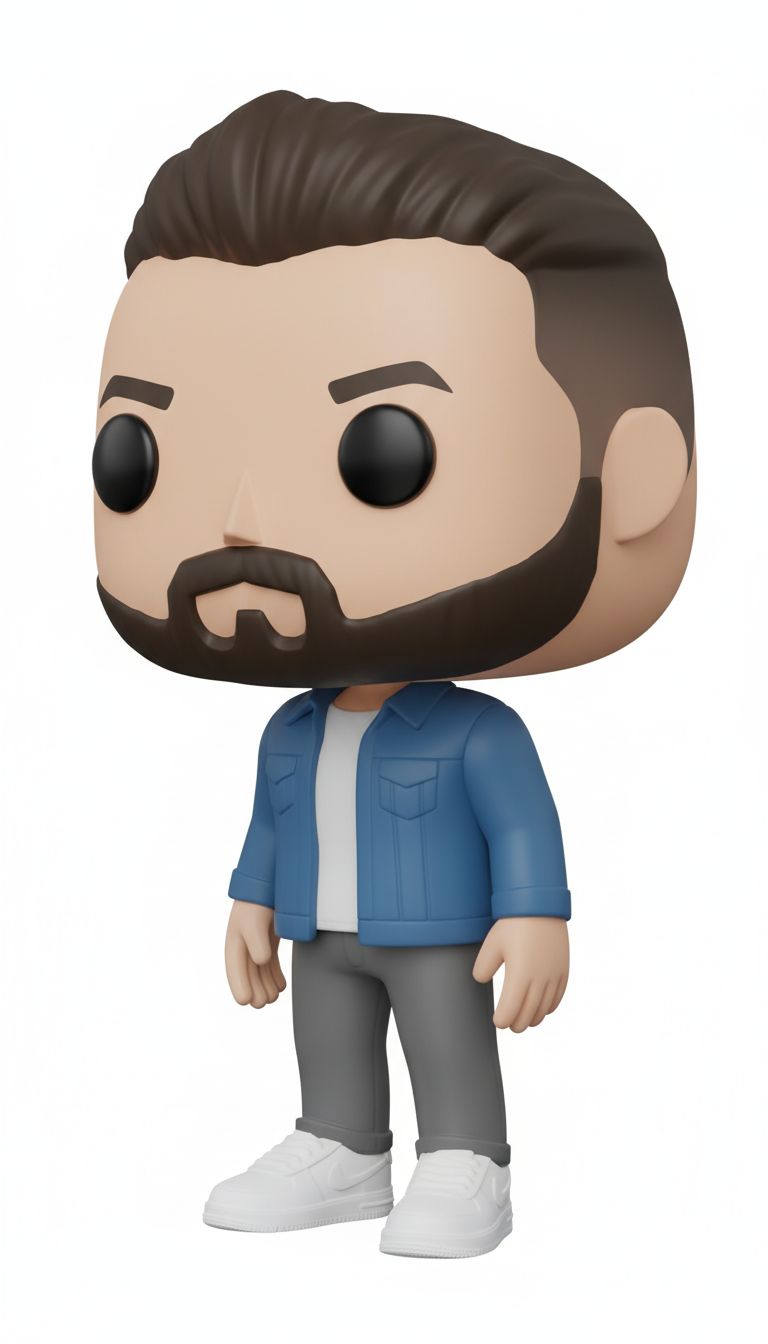 Funko Pop vinyl figure of a man with short dark hair styled upwards with faded sides, and a dark bea