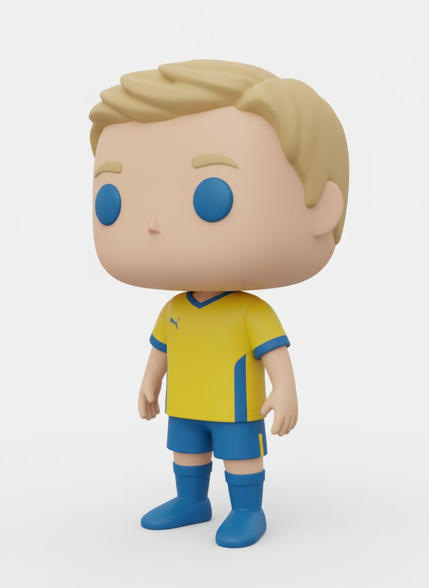 Funko pop style character based on the picture. With yellow soccer kit and blue shorts