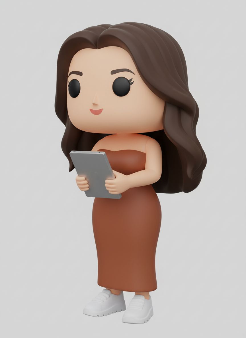 mulher, vestido longo terracota, tenis branco, cabelo solto, segurando um tablet. sem óculos escuro,
