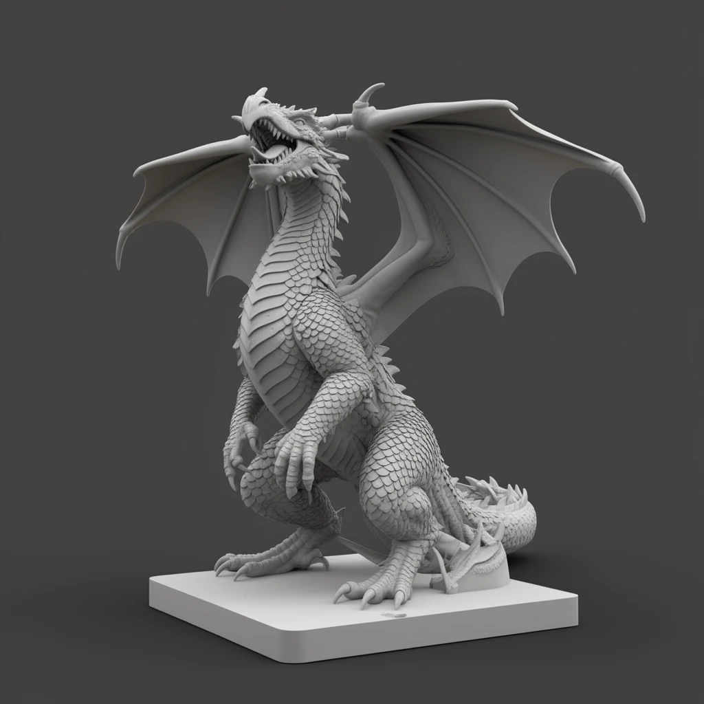 3D-printable dragon rearing with wings half-spread on a flat base, sculpted as watertight manifold g