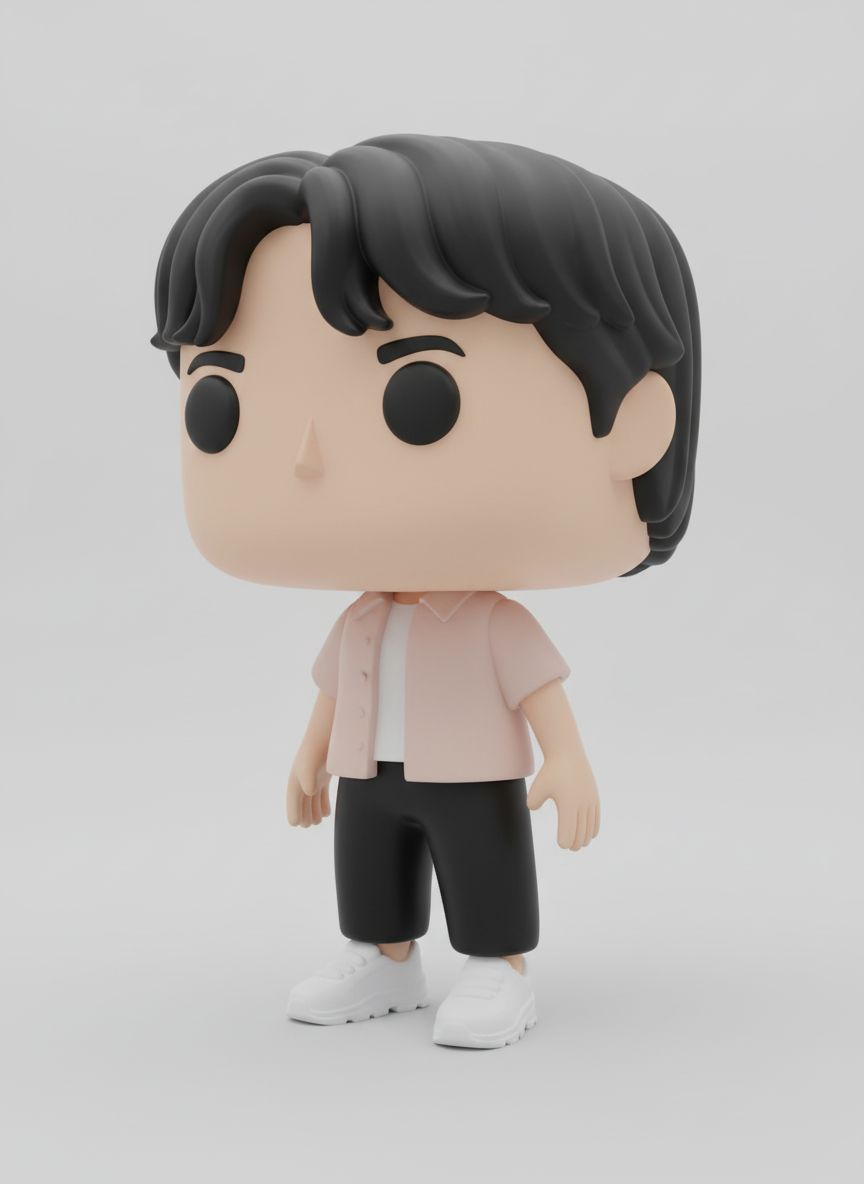funko pop toy, man, large head, short rectangular head, short proportions. Short black hair, middle