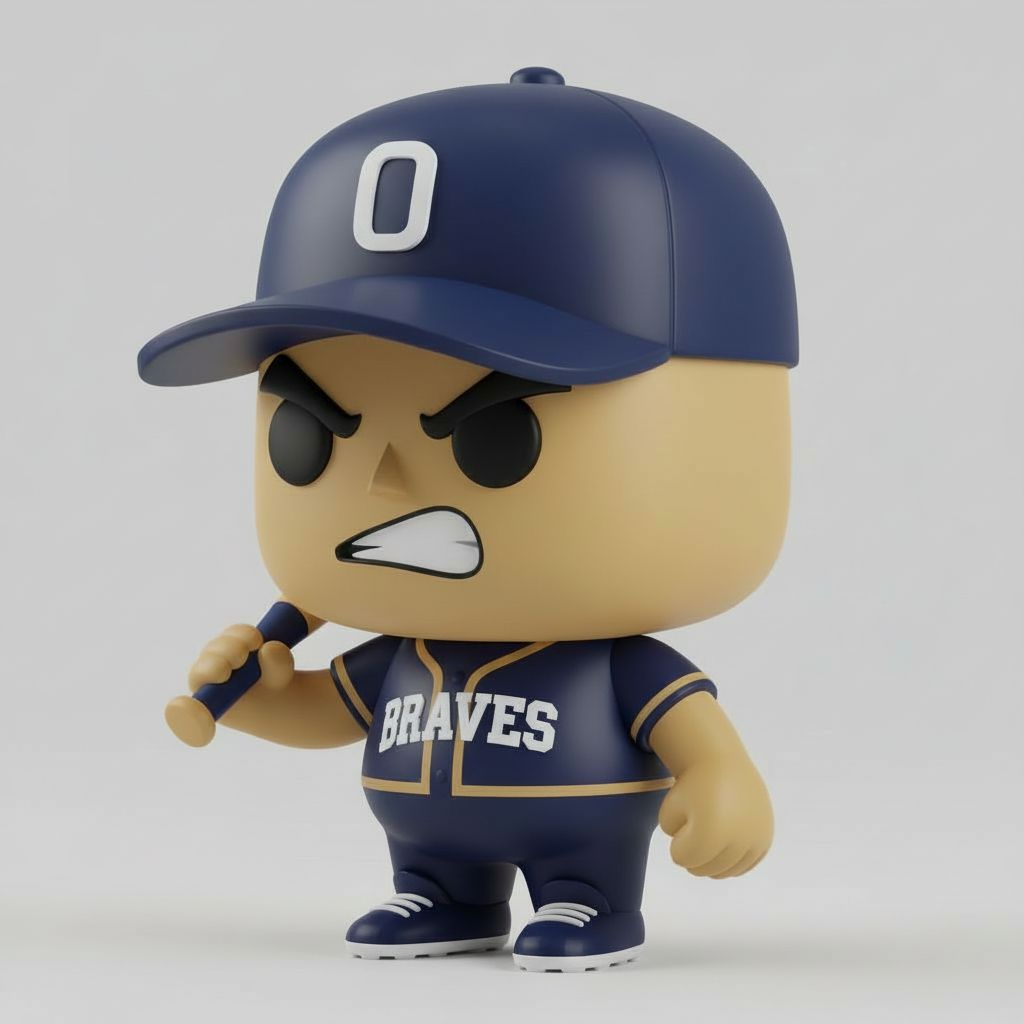 funko pop style baseball mascot, oversized head, small body, holding bat over shoulder, wearing base