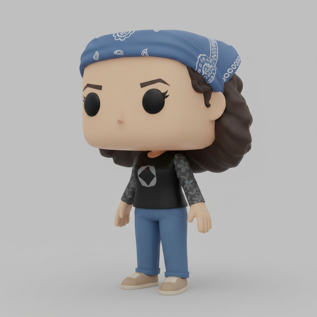funko pop toy, woman, large head, short rectangular head, short proportions, funko pop eyes. dark br